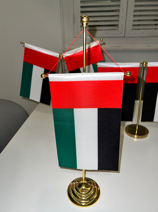 United Arab Emirates Prestige Premium Table Desk Flag | 14 x 21 cm - 1 pc | Double-Sided Satin with 45 cm Steel Pole & Base (Silver/Gold) | Customizable